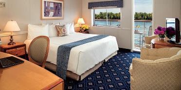 These 283 sq. ft. staterooms are located on the top deck which provides privacy and great panoramic views. The living space is comparable to that of a fine hotel room and offers a writing desk, a closet, a full-size bathroom and a private balcony.